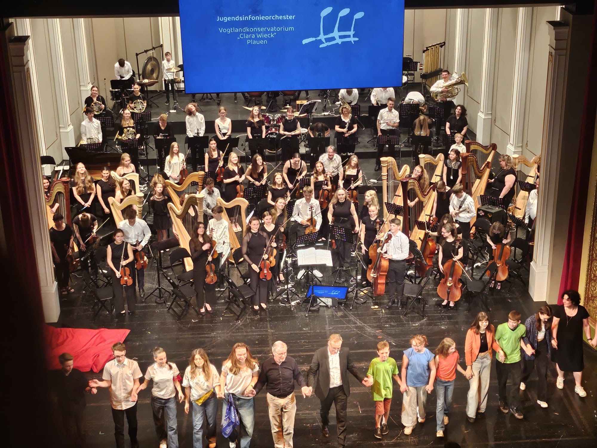 Zum „JOP“ 2024/2025 haben sich 30 Jugendorchester aus ganz Deutschland beworben und das Jugendsinfonieorchester des Vogtlandkonservatoriums Clara Wieck Plauen hat es gemeinsam mit drei Schauspielern unserer Grundschule Neundorf geschafft, den ersten Preis für sein Programm „growing up – a journey of life“ zu belegen.